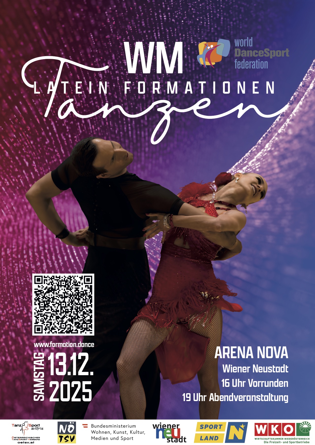 Am Samstag, dem 13. Dezember 2025, veranstalten der UTSC Dancefire Wiener Neustadt und der UFTSC Perchtoldsdorf die Weltmeisterschaft der Lateinformationen in der Arena Nova Wiener Neustadt.